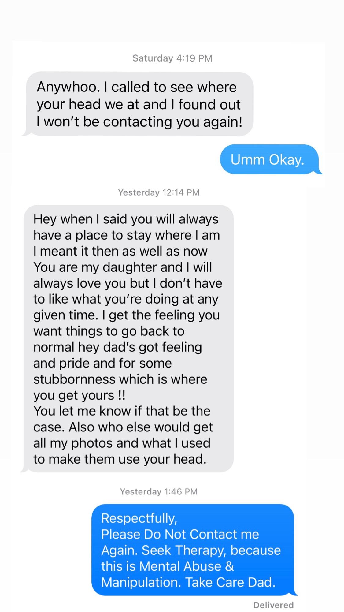 We have an exchange of text messages, and I made the decision to block him from contacting me again. If you cant love me, as needed, then I am not going to allow you to freely hurt me.