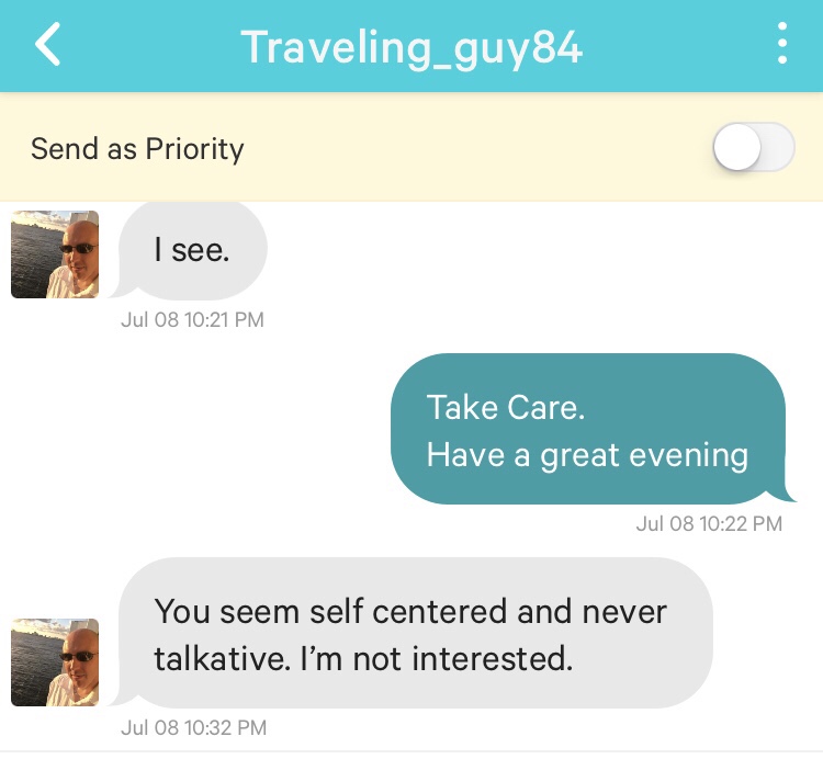 I laughed at the response. I mean how could I not? You’re not interested yet you went out of your way to gain my attention. I could’ve respected, him not responding, or even, a “Good Night” in return. We as women have been conditioned to support the male ego, let them down softly, try not to reject them, and if you do, put the blame on you. Nope! Although I will forever be respectful in my dealings, protecting your (fragile) Ego will never be my concern.